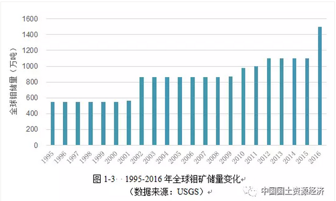 據(jù)美國(guó)地質(zhì)調(diào)查局統(tǒng)計(jì),過(guò)去的二十年間全球鉬礦儲(chǔ)量總體呈上升趨勢(shì)。1995—2001年全球鉬礦儲(chǔ)量保持在550萬(wàn)噸左右,2002—2009年增長(zhǎng)至860萬(wàn)噸,2010年以后穩(wěn)步增長(zhǎng),2016年增至1500萬(wàn)噸,較1995年增加了950萬(wàn)噸(圖3)。其中儲(chǔ)量增長(zhǎng)最多的國(guó)家是中國(guó)。