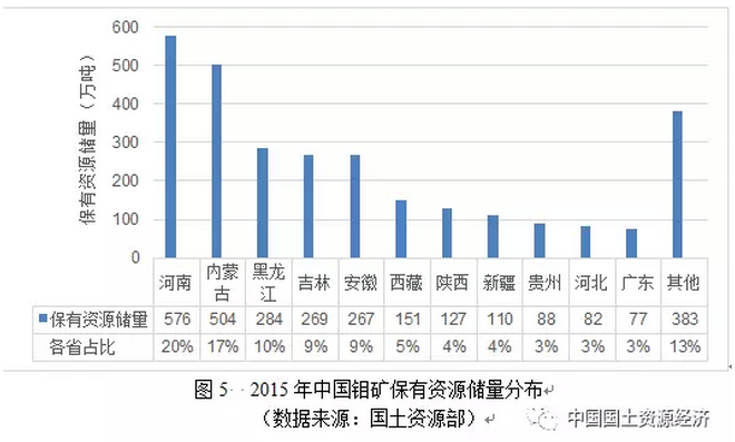據(jù)國(guó)土資源部統(tǒng)計(jì)[,截至2015年底中國(guó)查明鉬礦區(qū)749處,保有資源儲(chǔ)量2918萬(wàn)噸(金屬量,下同)。其中基礎(chǔ)儲(chǔ)量833萬(wàn)噸、資源量2085萬(wàn)噸。按保有資源儲(chǔ)量統(tǒng)計(jì),排名前10位的省區(qū)依次為河南、內(nèi)蒙古、黑龍江、吉林、安徽、西藏、陜西、貴州、河北和廣東,10省區(qū)保有資源儲(chǔ)量合計(jì)約占全國(guó)總量的83%。其中,排名前五位的省區(qū)合計(jì)約占全國(guó)總量的65%,資源分布相對(duì)集中(圖5)。