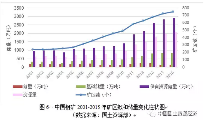 據(jù)國(guó)土資源部統(tǒng)計(jì),2001—2015年中國(guó)查明的鉬礦區(qū)數(shù)量由237個(gè)增加到749個(gè),增加了512個(gè);鉬礦保有資源儲(chǔ)量從962萬(wàn)噸增加到2918萬(wàn)噸,增量達(dá)1956萬(wàn)噸,年均新增鉬礦保有資源儲(chǔ)量140萬(wàn)噸,相當(dāng)于每年新發(fā)現(xiàn)2個(gè)超大型礦床(圖6)。